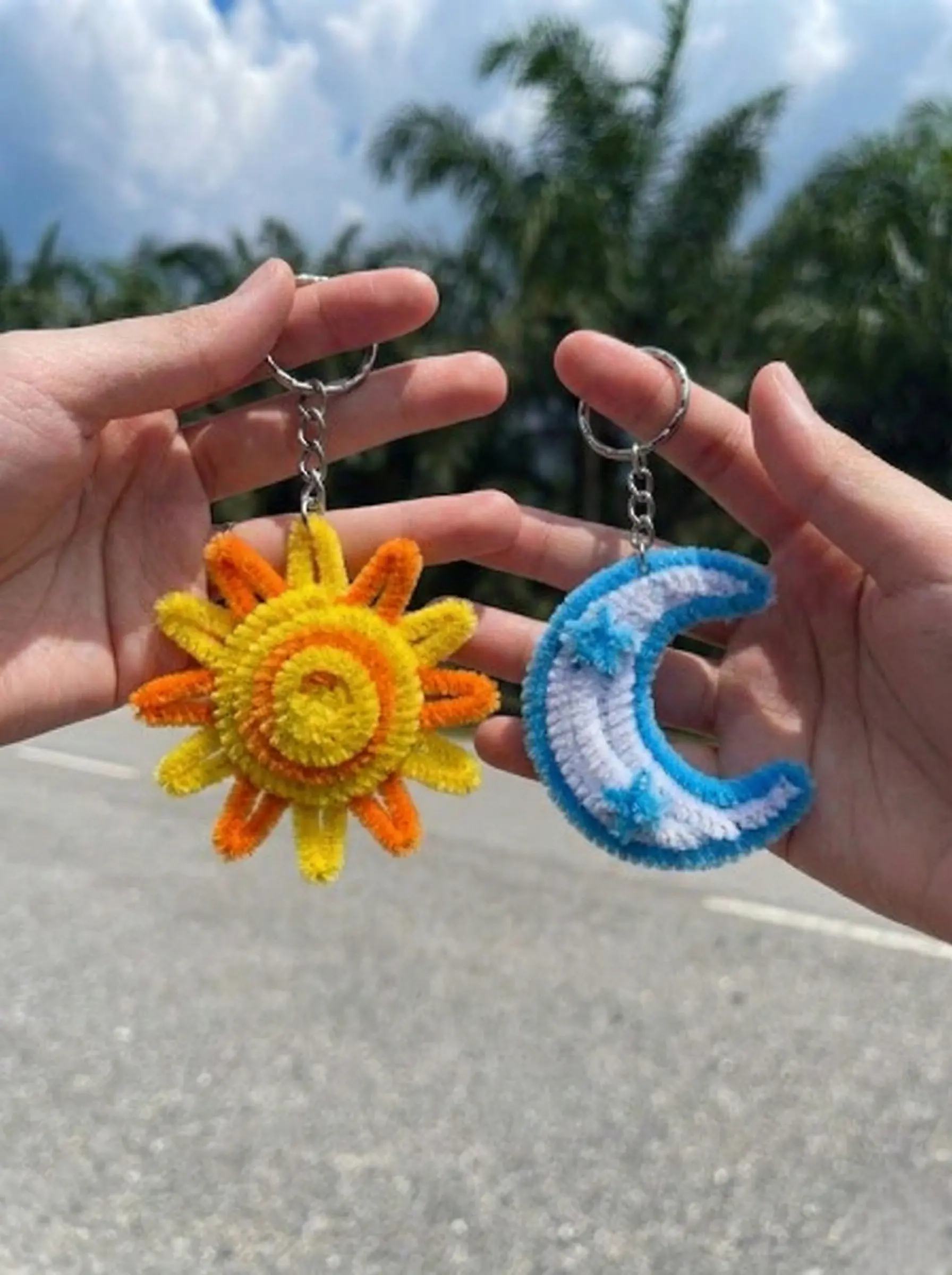 The set includes two complementary designs: a radiant, warm yellow and orange sun, alongside a soothing blue and white crescent moon accented with tiny stars. Each charm is meticulously handcrafted from premium, plush fuzzy wire (pipe cleaners), giving them a delightful, soft texture that stands out from standard plastic or metal accessories.