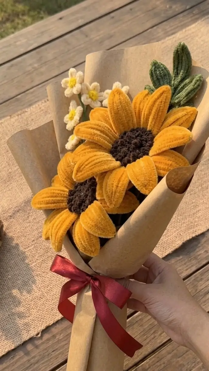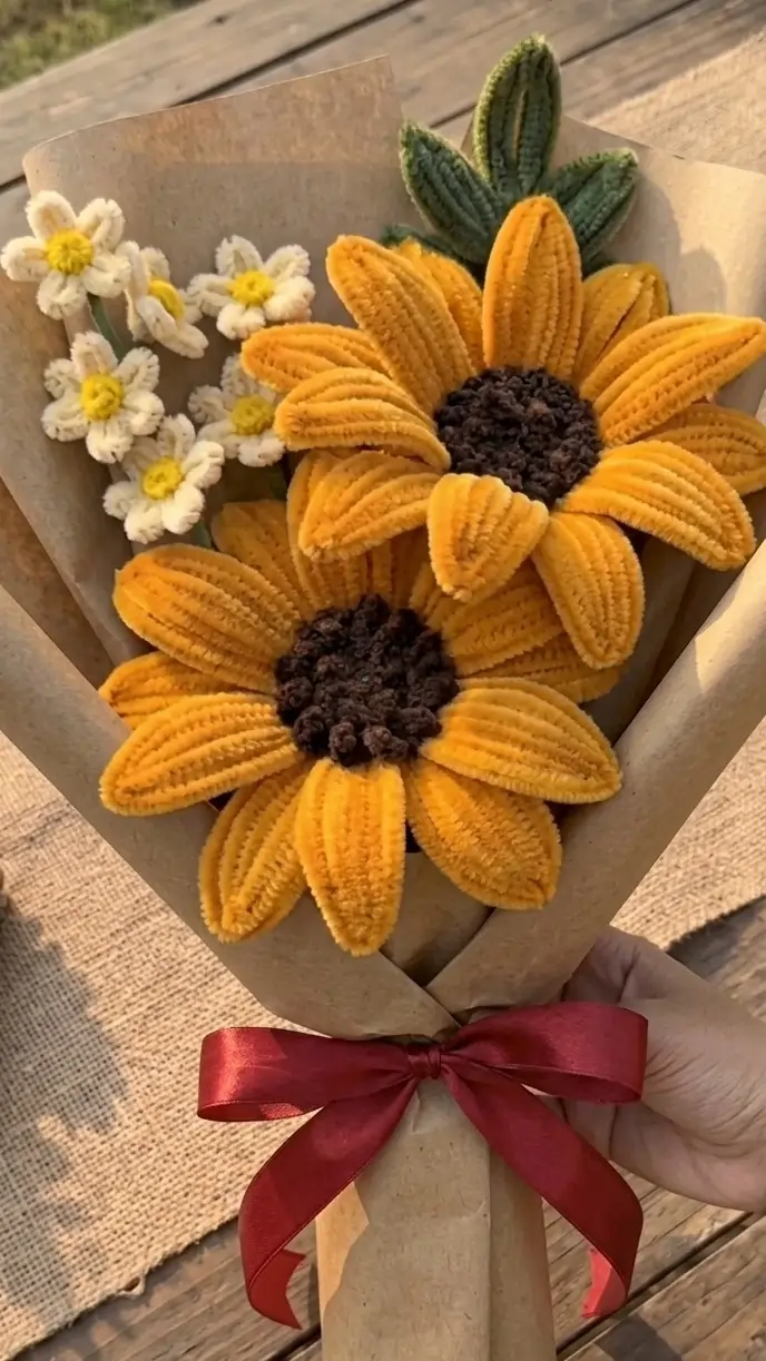 Bring a permanent ray of sunshine to your loved ones with our stunning Handmade Sunflower & Daisy Bouquet. This beautiful, uplifting arrangement features two large, magnificent sunflowers with rich brown textured centers, perfectly complemented by a cluster of six delicate, small white daisies and lush green foliage. Every single petal and leaf is meticulously hand-sculpted from premium fuzzy wire (pipe cleaners), giving the flowers a luxurious, velvety feel that completely outlasts any fresh bloom.