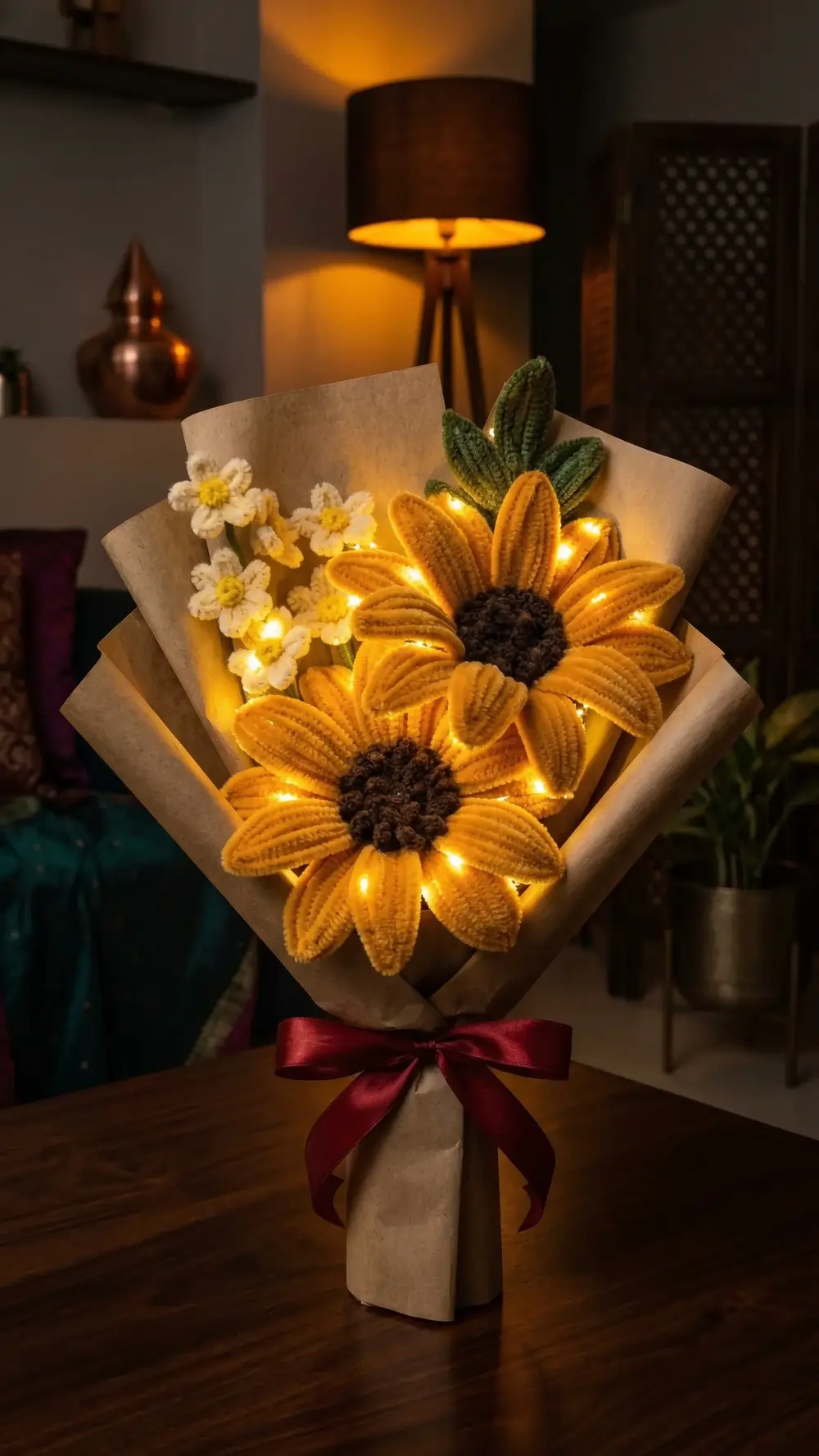 This bouquet is presented in our rustic, earthy Classic Wrapping, featuring natural brown kraft-style paper elegantly tied together with a rich burgundy satin ribbon. For an extra touch of magic, this classic edition also includes warm LED fairy lights to beautifully illuminate the blooms at night! It is the ultimate, highly useful gift for birthdays, graduations, Mother’s Day, or anniversaries. Beyond gifting, it acts as a permanent, cheerful piece of home or desk decor.