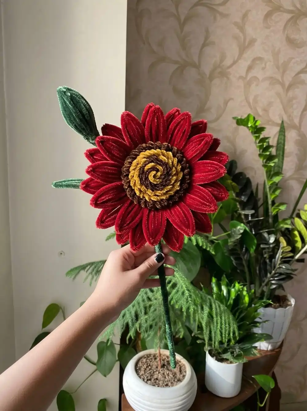 Every detail is meticulously hand-shaped from premium, plush fuzzy wire (pipe cleaners). The petals feature a striking, passionate red hue that radiates outward from a beautifully coiled, highly textured brown and yellow center. Supported by a thick, sturdy green stem accompanied by an elegant side leaf, this flower stands tall and proud.