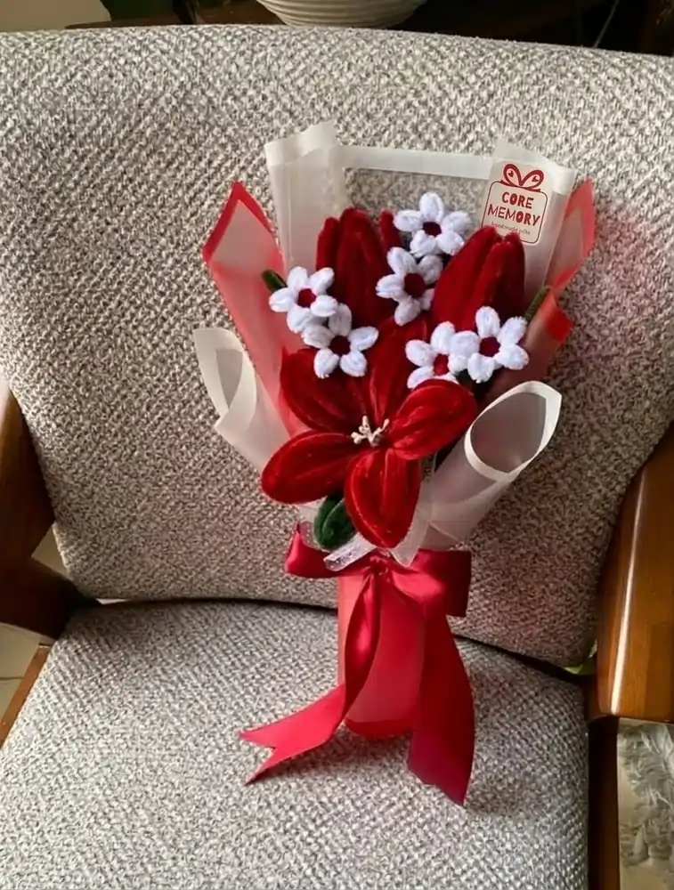 Every single petal is meticulously handcrafted from premium, plush fuzzy wire (pipe cleaners). This gives the larger-than-usual flowers a luxurious, tactile texture that mimics real petals but will never fade, wilt, or require watering. The presentation is equally sophisticated—the blooms are beautifully encased in layers of frosted translucent paper and soft red accents, tied together with a glossy red satin ribbon and finished with our bespoke Core Memory tag.