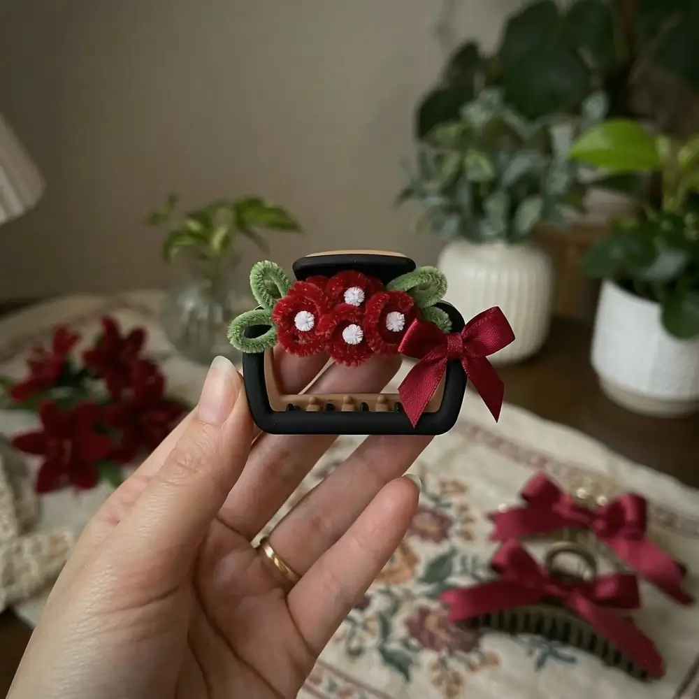 RedRomantica Mini Floral Hair Claw! A small clip with handmade red fuzzy wire flowers & a ribbon bow. Perfect useful birthday gift. Custom via WhatsApp. Handmade to order (13-14 days). Shop now!