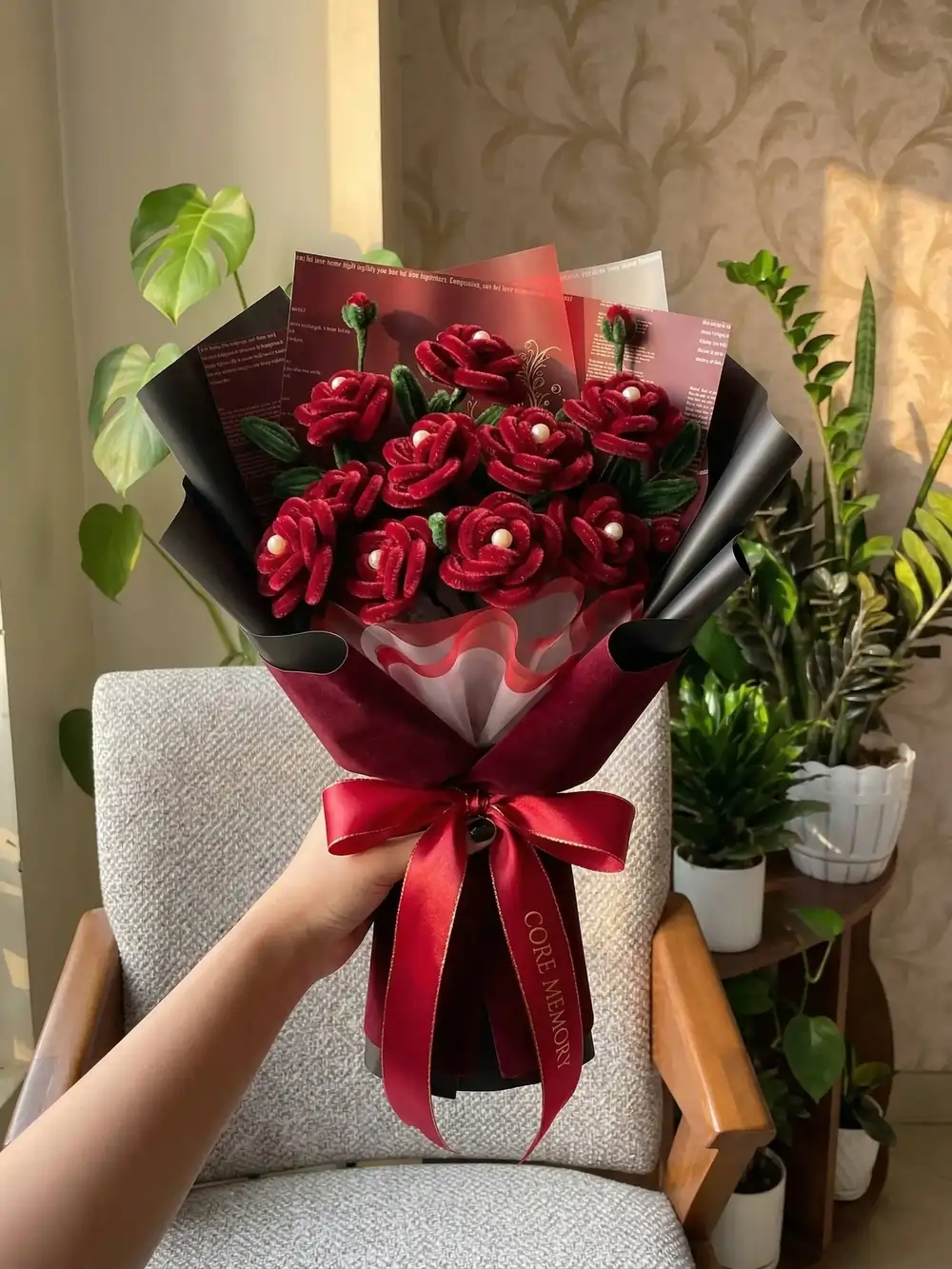 Every element is meticulously handcrafted from premium, plush fuzzy wire, giving the petals a rich, velvety texture that completely outlasts any fresh bloom. Elevating the elegance, each fully bloomed rose is adorned with a delicate white pearl nestled right in its center. The presentation is nothing short of majestic—the flowers are expertly swathed in sophisticated layers of frosted white, rich burgundy, and sleek matte black floral paper. It is flawlessly tied together with a glossy red satin ribbon featuring our signature Core Memory branding in elegant gold lettering.